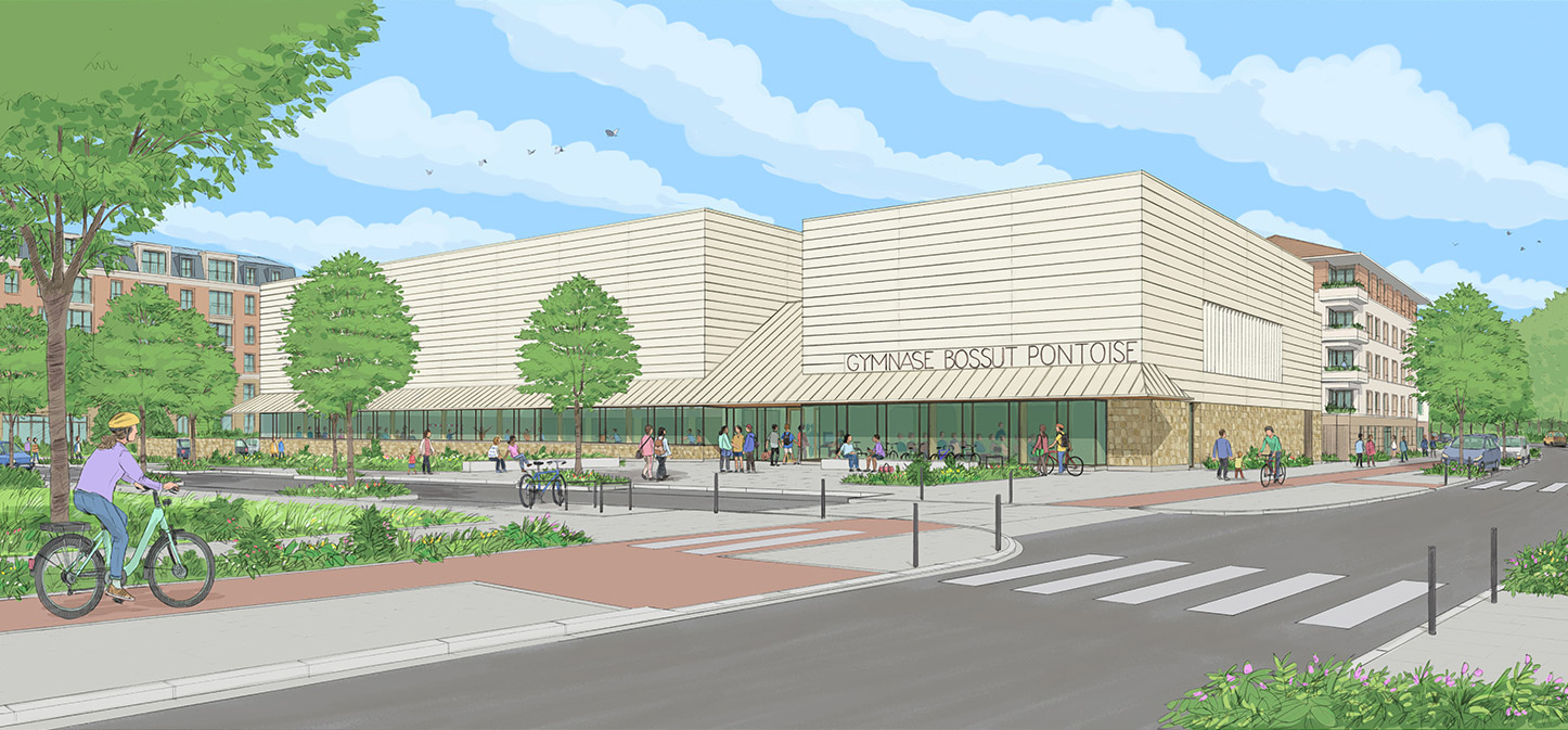 Notre projet architectural assume la frontalité attendue d'un équipement construit en tête de pont de la ZAC, à l'entrée de Pontoise.