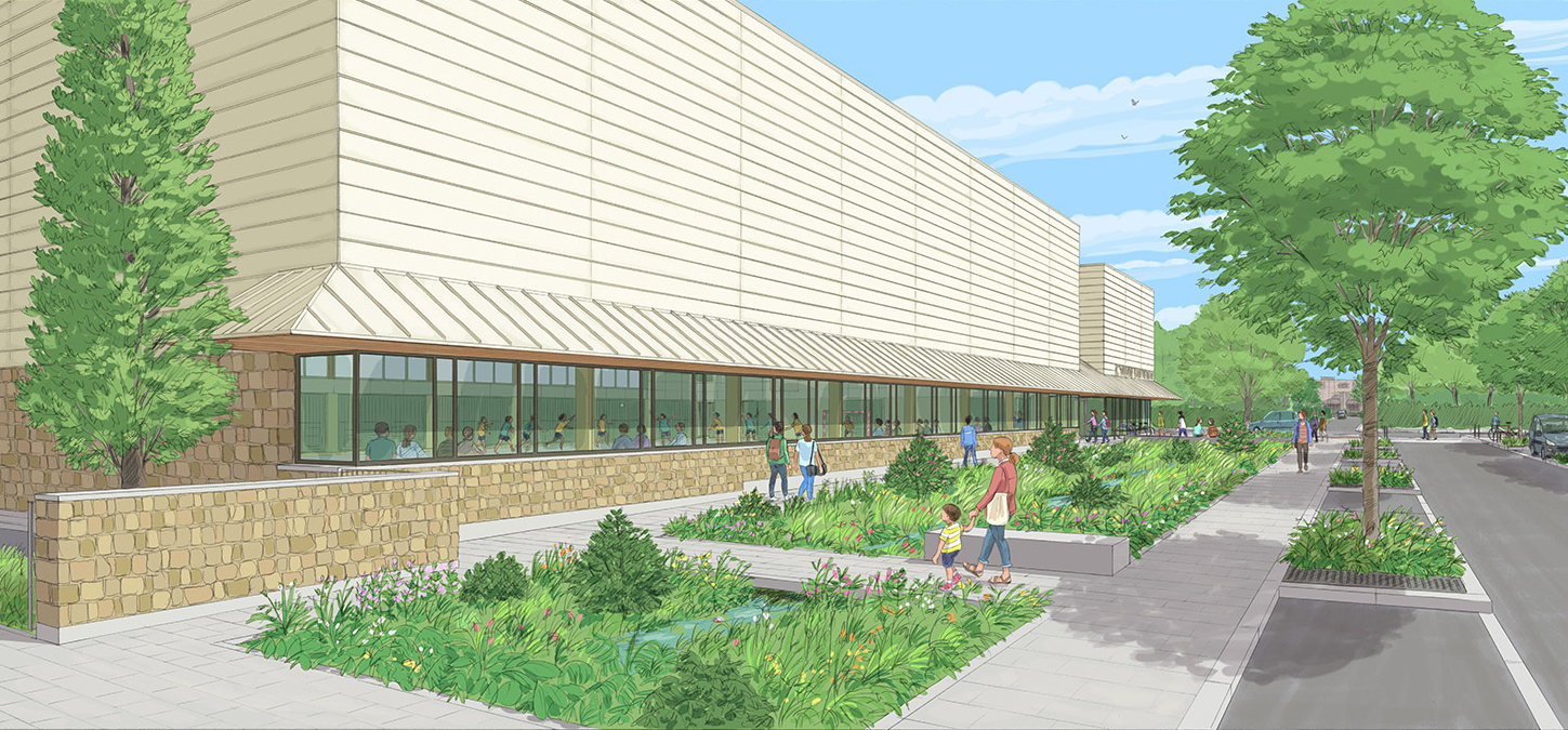 - Un long empochement planté sous la fenêtre basse du gymnase, en avant du débord du toit, soit un premier plan végétal esthétique, pourvoyeur de fraîcheur et de surface de gestion pluviale in situ.