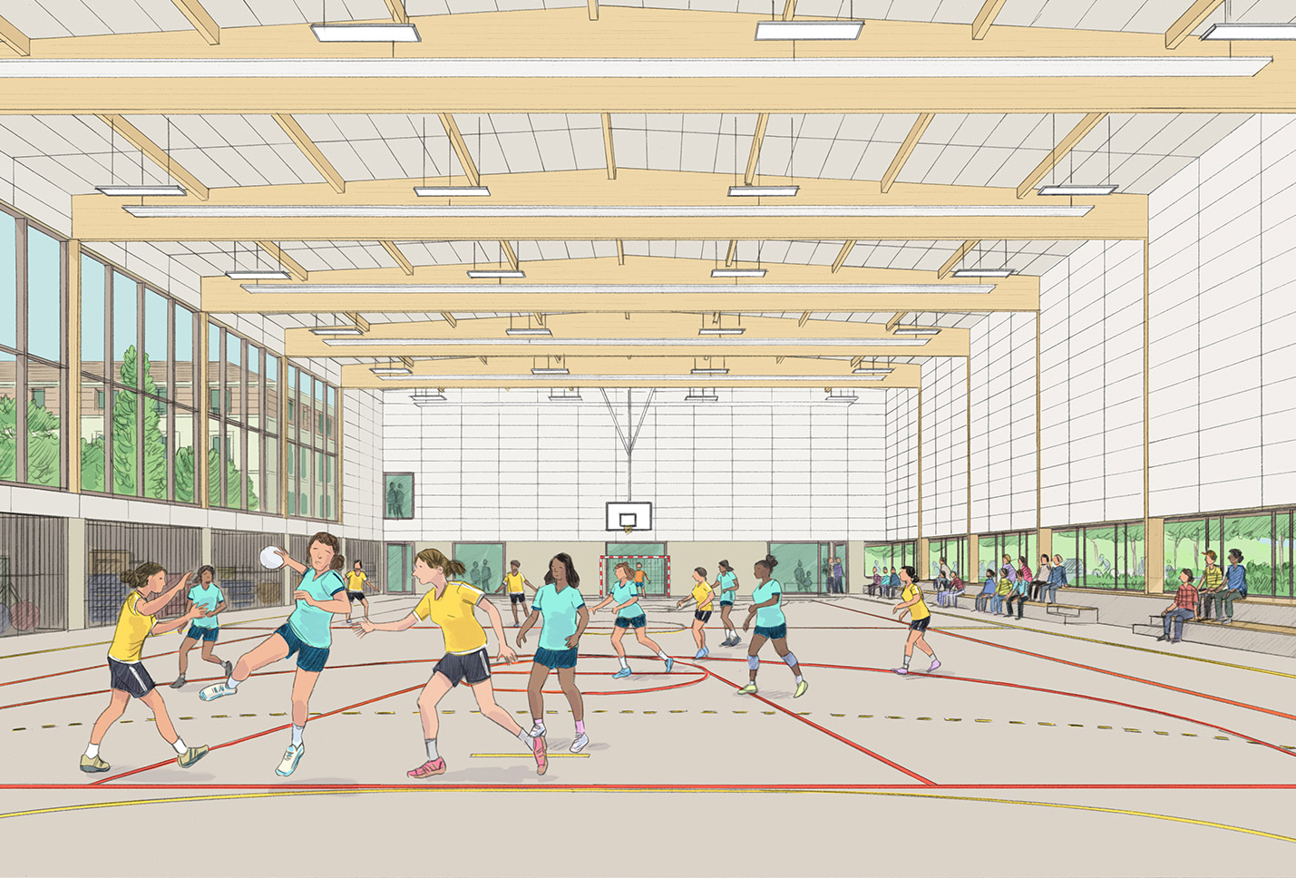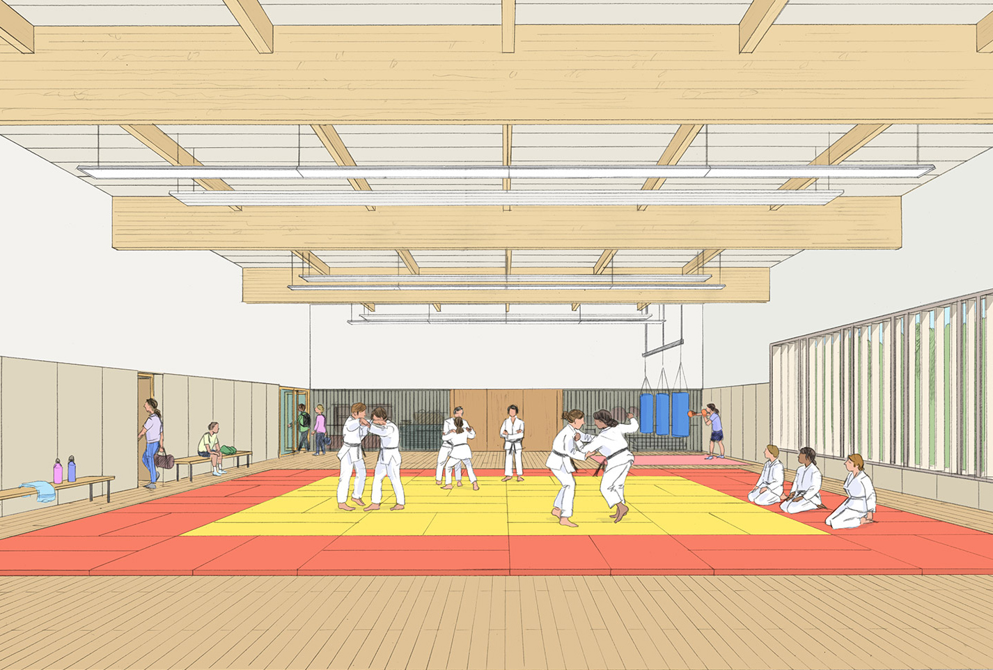 La destination du programme, le franchissement des portées des halles sportives, nécessitent des modes constructifs légers : charpente bois et enveloppe zinc laqué à joints debouts que nous installons sur un socle minéral solide conformément aux préconisations du règlement de la ZAC.