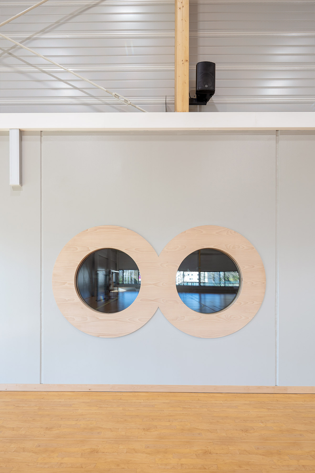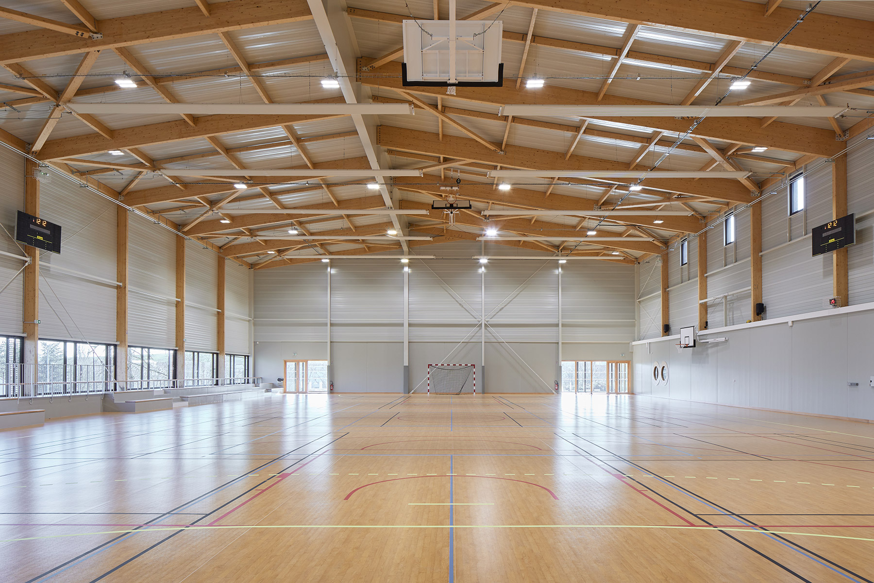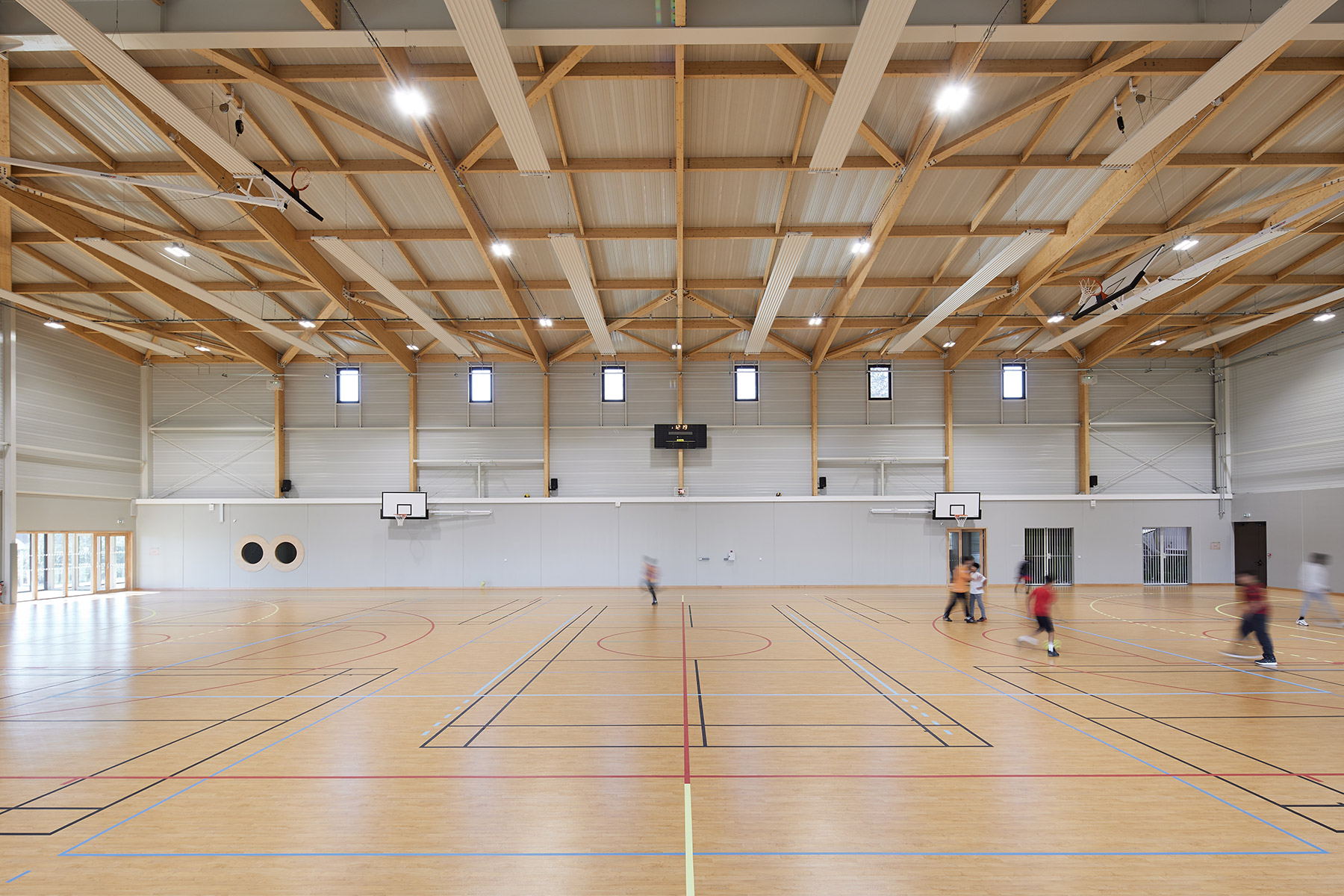 Halle Omnisports : salle d'évolution sportive de 23,5 m x 44m, tribunes, locaux accessoires, vestiaires, douches, rangement scolaire et clubs, bureaux.