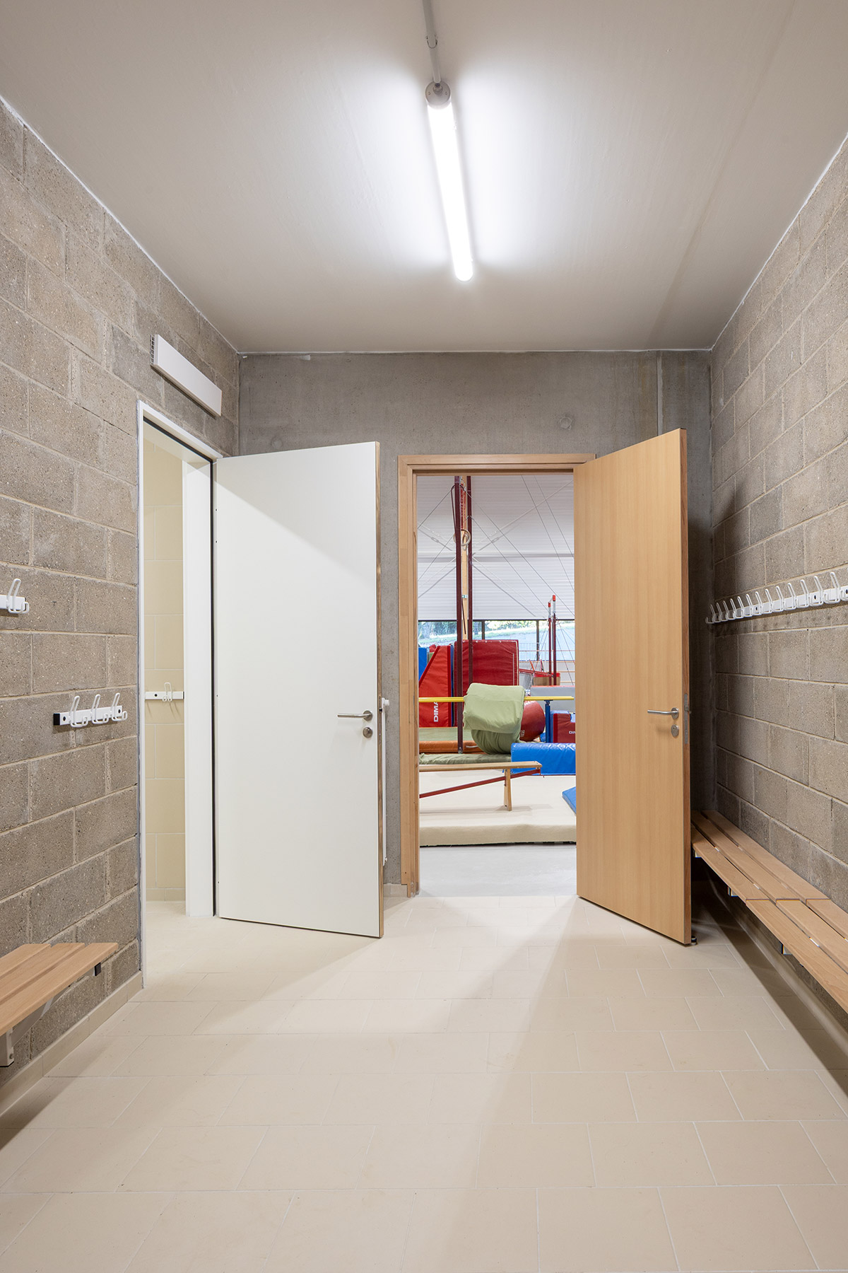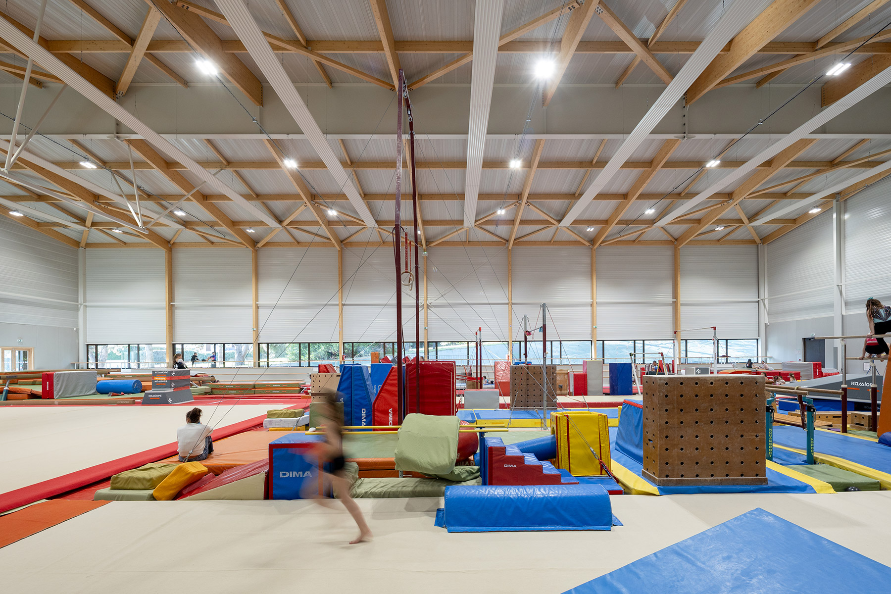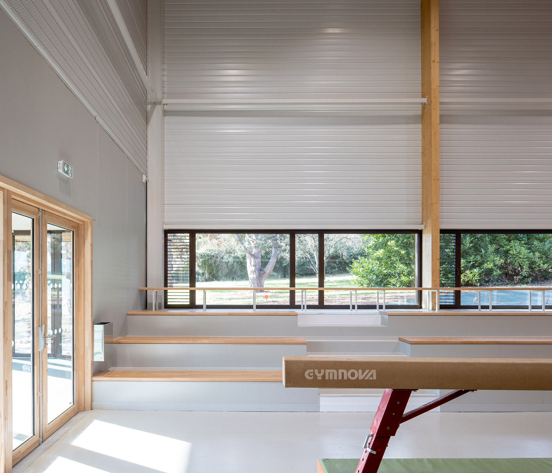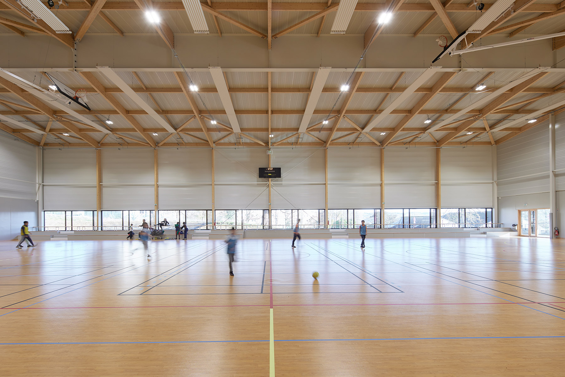 Halle de gymnastique : salle d'évolution sportive de 23,5 m x 44m, tribunes, locaux accessoires, vestiaires, douches, rangement, bureaux.