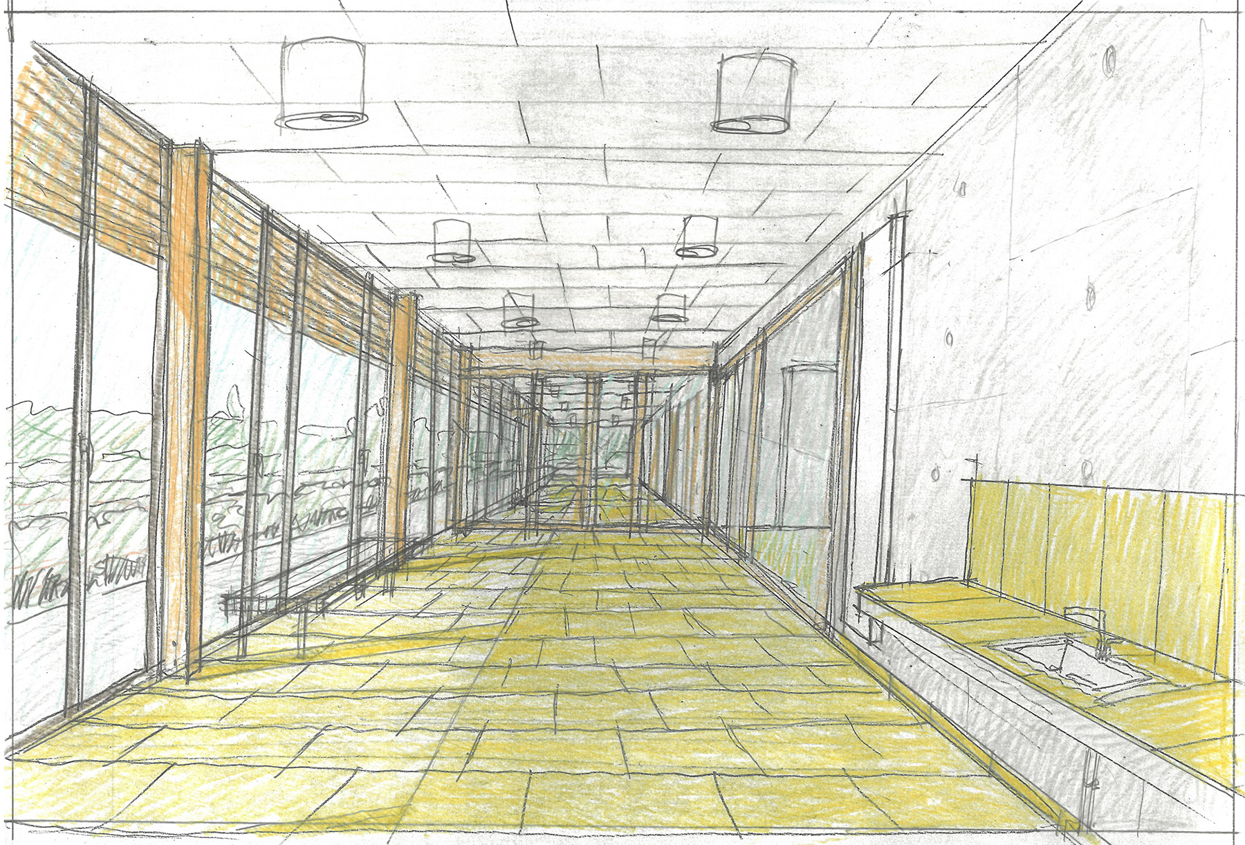 Le mur intérieur de fond de la galerie sud et le sol, très exposé aux vues extérieures, reçoit un carrelage vert qui permet au bâtiment de se fondre dans le paysage environnant.